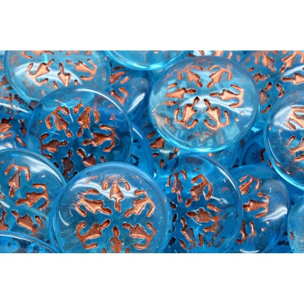 Akvamarínové sklo v kombinaci s precizním měděným dekorem vytváří z tohoto kabošonu dominantní prvek pro vaši autorskou tvorbu. Tento český skleněný kabošon o průměru 21 mm pochází z rodinné dílny Rutkovský, kde se dodnes udržuje tradice ručně mačkaných korálků a skleněných komponentů. Průzračný základ s kovovým motivem vločky vynikne zejména v náhrdelnících nebo jako centrální motiv bohatě zdobených broží.