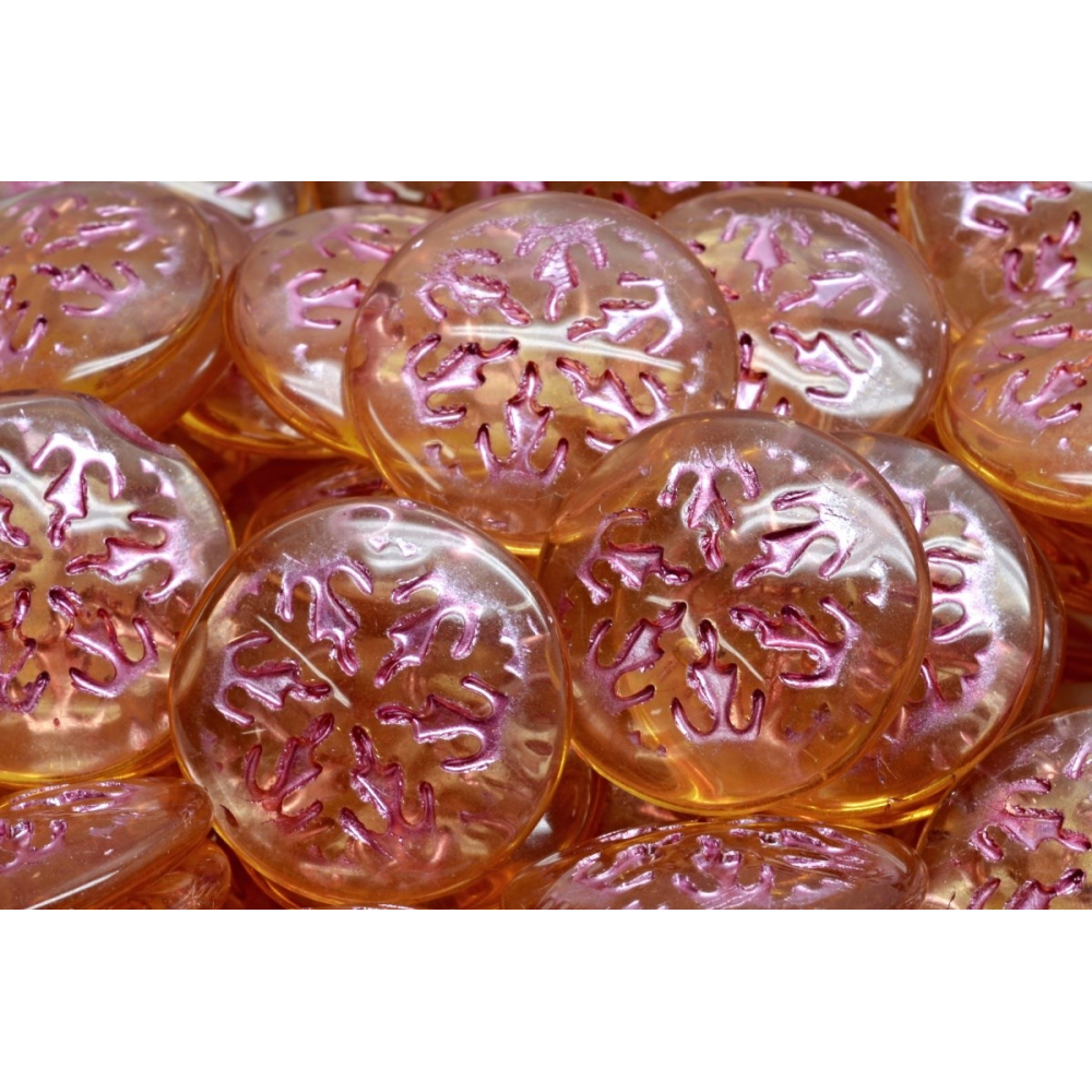 Broskvová barva s metalickým růžovým dekorem dodává šperku hloubku a podtrhuje unikátní Cabochon Beads tvar o velikosti 21 mm. Tento český skleněný kabošon vyniká svým lesklým povrchem, který krásně odráží světlo a dává vyniknout každému detailu zimního motivu vyrytého hluboko do skla.