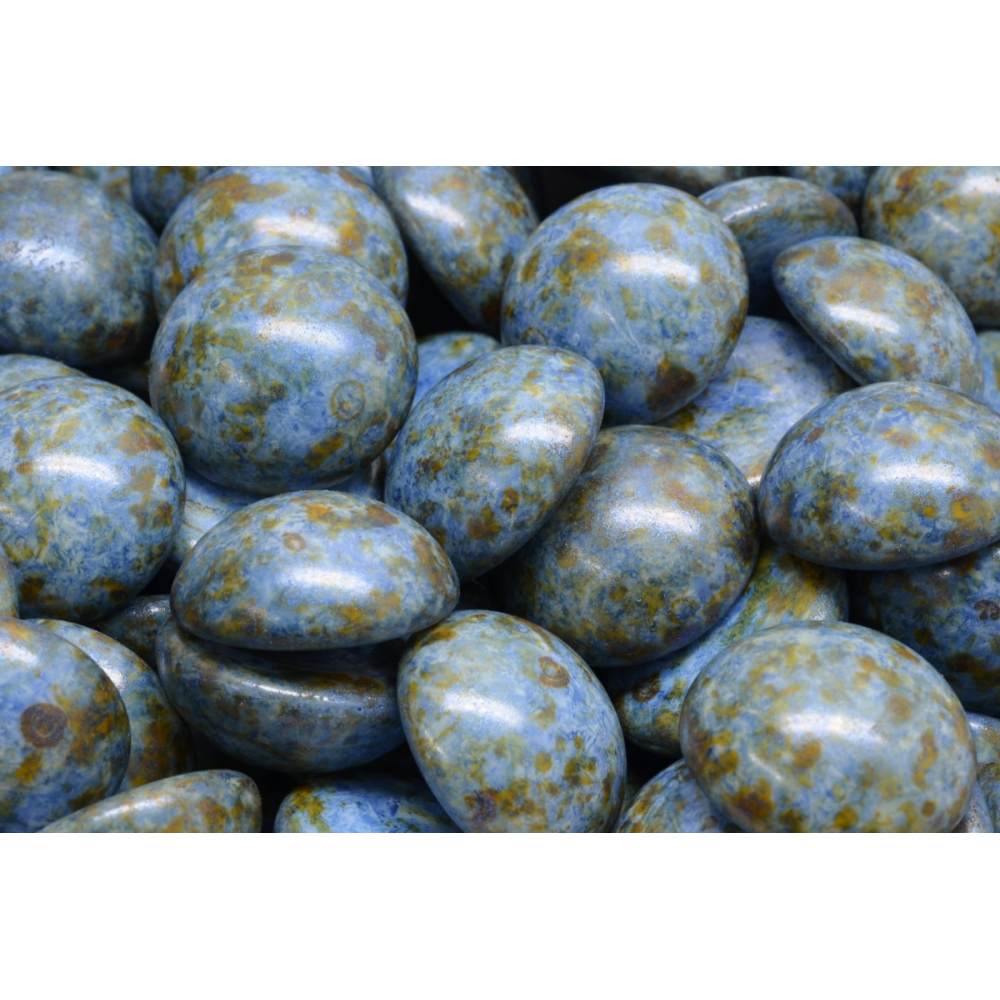 Modrá barva s jemným hnědým žíháním evokuje barvy divoké přírody a starobylých artefaktů, což skvěle doplňuje techniku bead embroidery neboli korálkové výšivky. Ručně mačkané české skleněné korálky od rodinné firmy Rutkovský jsou proslulé svou precizností a stálostí barev, což oceníte zejména u náročných projektů, jako jsou bohatě zdobené náušnice nebo náhrdelníky. Díky ploché spodní straně se s kabošony velmi snadno pracuje při lepení na textilní podklady.