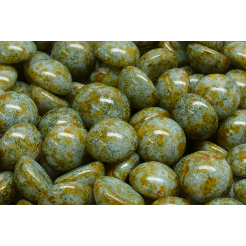 Skleněný materiál s neprůhlednou úpravou typu chalk poskytuje stabilní základ pro dekorativní povrchovou úpravu Herbs & Spices. Tento specifický vizuální efekt imituje přírodní kameny a dodává šperkům organický, lehce rustikální vzhled. Kabošony o průměru 12 mm jsou charakteristické svou plochou spodní stranou, která umožňuje snadné vlepování do kovových lůžek nebo obšívání korálky.