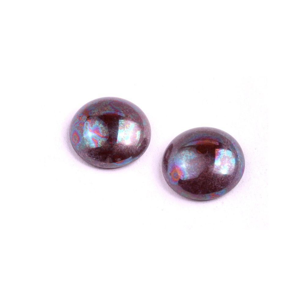 Hluboké burgundské tóny se mísí s fascinujícími duhovými odlesky v tomto skleněném kabošonu o průměru 18 mm, který v sobě nese hrdý odkaz na tradiční české sklářství. Rodinná firma Rutkovský vytvořila tento kousek pomocí ručního lisování, což zaručuje precizní tvar a výjimečnou optickou hloubku barev, která se proměňuje s každým dopadem světla. Povrchová úprava s efektem Iris připomínající vzdálenou galaxii dodá vašim šperkům nádech luxusu a umělecké originality, kterou jinde nenajdete.