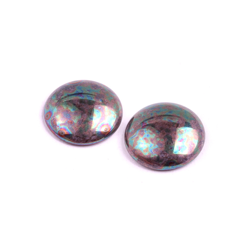 Duhové odlesky s kovovým nádechem definují tento skleněný kabošon o průměru 25 mm, který pochází z dílny renomovaného českého výrobce Rutkovský. Jeho povrchová úprava připomíná olejovou skvrnu na tmavém podkladu, což dodává výslednému šperku mystický a luxusní vzhled. Oproti běžným broušeným kamenům nabízí tento ručně mačkaný prvek hladký, vypouklý povrch, který dokonale zachycuje světlo z různých úhlů a mění barvy při každém pohybu.