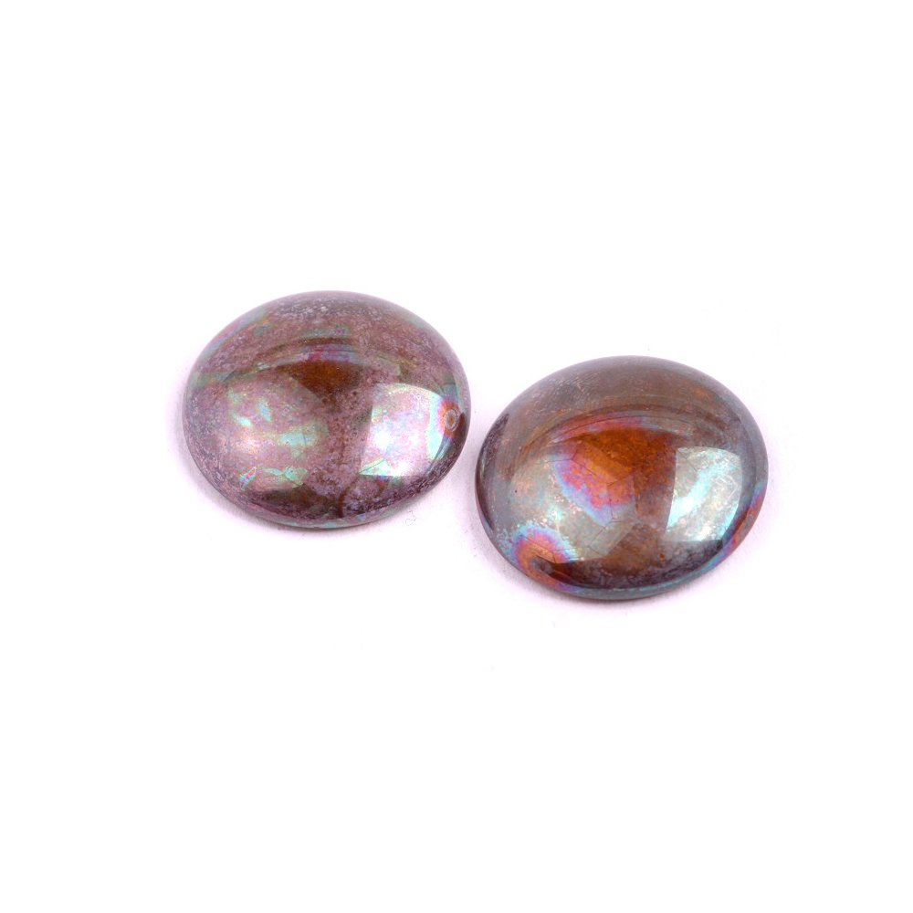 Hnědá barva s kovovým nádechem se v těchto skleněných kamenech prolíná s fascinujícími duhovými odlesky, které připomínají pohled do hlubokého vesmíru. Každý skleněný kabošon o průměru 25 mm vyniká svou vizuální hloubkou a jedinečnou hrou světla na svém lesklém povrchu. Tento komponent je naprosto ideální jako centrální prvek pro výrazné náhrdelníky nebo autorské brože, kde naplno vynikne jeho metalický efekt a bohatá textura.
