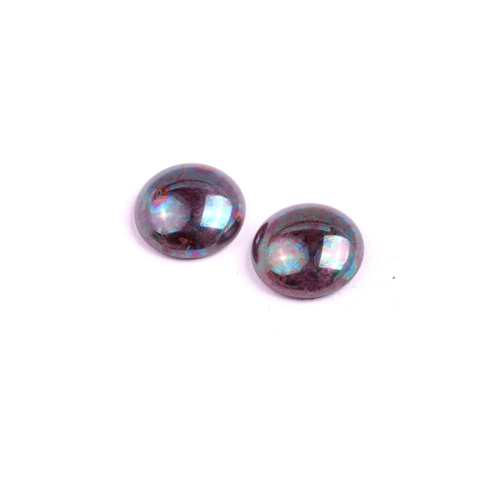 Temně fialový tóny s fascinujícími měňavými odlesky v barvách pavího peří dělají z tohoto skleněného kabošonu dominantní prvek každého autorského šperku. Cabochon Beads o průměru 18 mm pocházejí z dílny rodinné firmy Rutkovský, kde se snoubí tradiční české sklářství s moderním designem a precizním řemeslným zpracováním.