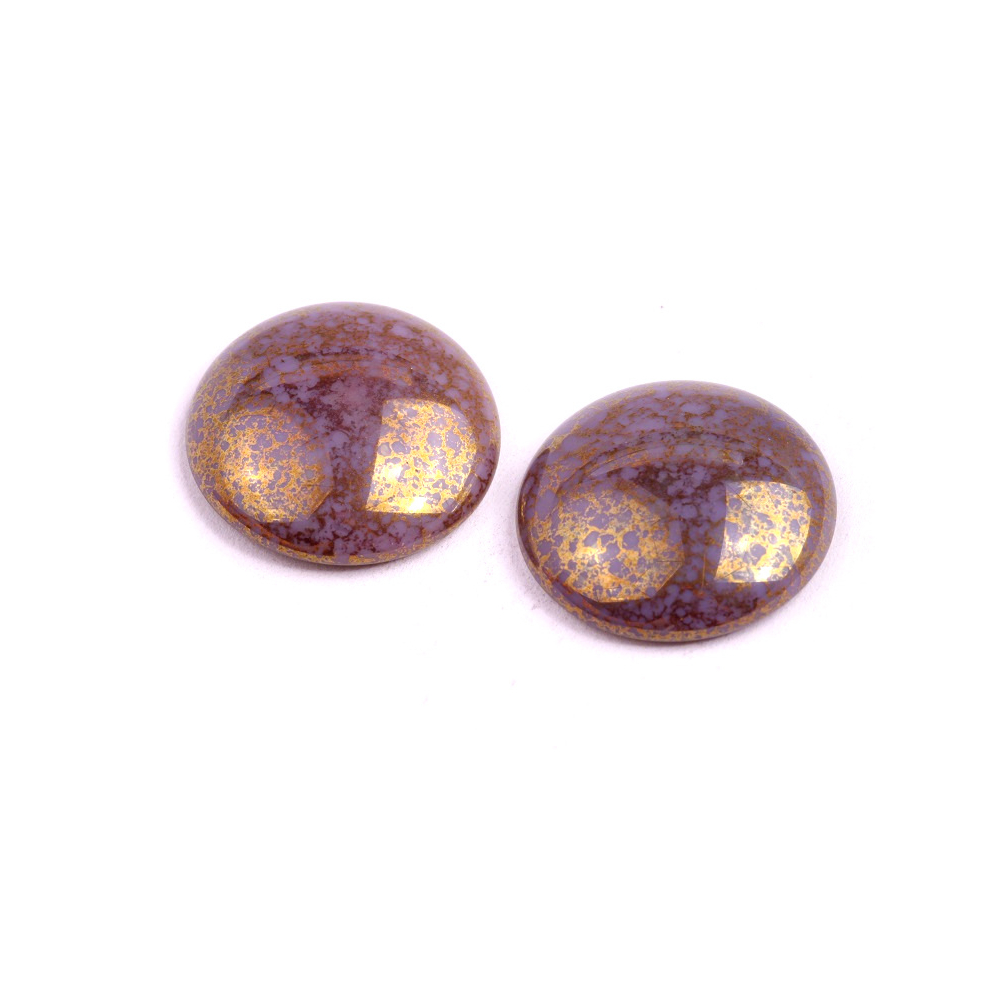 Fialové skleněné Cabochon Beads o průměru 25 mm představují vrchol tradičního českého sklářství z dílny rodinné firmy Rutkovský. Tyto ručně mačkané kabošony se vyznačují precizním kruhovým tvarem s plochou zadní stranou, což je ideální pro lepení do lůžek nebo náročné obšívání korálky. Povrchová úprava s efektem travertine v barvě 23030-15496 kombinuje sytý lila základ s nepravidelnými zlatavými skvrnami, které dodávají každému kusu unikátní, starožitný vzhled a hloubku.