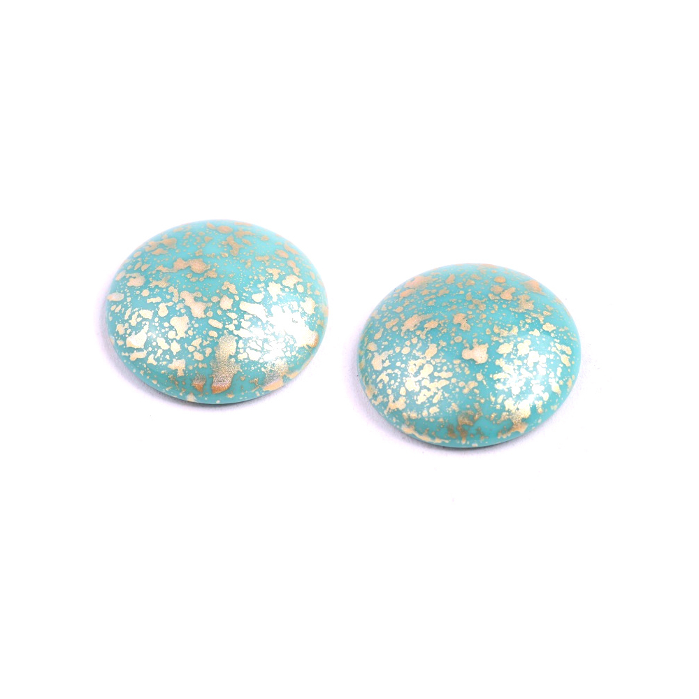 Kombinace tyrkysové a zlaté barvy odpovídá aktuálním trendům v designu šperků, kde dominují přírodní motivy a imitace vzácných kamenů. Tento skleněný kabošon skvěle doplňuje kovové komponenty v odstínech starostříbrné nebo starozlaté, čímž snadno vytvoříte autentický vintage vzhled s moderním nádechem.