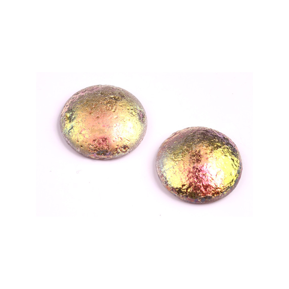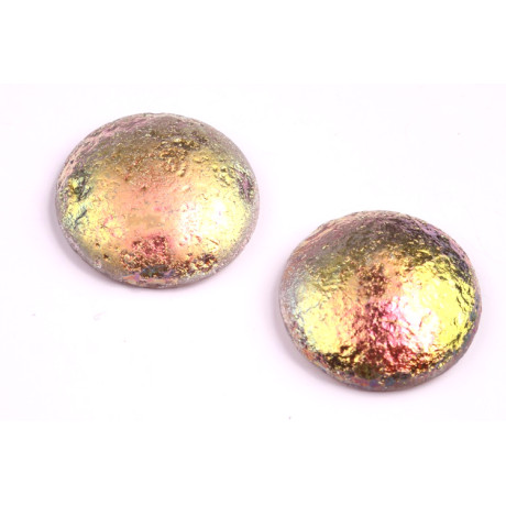 Duhová povrchová úprava s intenzivními kovovými odlesky definuje tento velký skleněný kabošon o průměru 25 mm, který pochází z dílny rodinné firmy Rutkovský. Každý kus představuje vrchol tradičního českého sklářství, kde se klade důraz na precizní ruční výrobu a jedinečnost každého výlisku. Specifický povrch typu Etched v kombinaci s efektem Vitrail (kód 28137 - V) vytváří dramatickou texturu připomínající surový minerál, což z něj činí ideální dominantu pro autorský šperk.