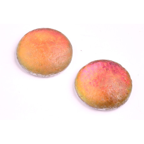 Matný, leptaný povrch v kombinaci s vakuovým pokuvem vytváří fascinující hru světla, která vynikne zejména při technice bead embroidery (korálková výšivka) nebo při obšívání drobným rokajlem. Tento kabošon lze také snadno vlepovat do kovových lůžek nebo využít při technice wire-wrapping, kde drátování podtrhne jeho organický vzhled. Vícebarevná paleta přecházející od hřejivých tónů až po jemné odlesky umožňuje snadné kombinování s dalšími skleněnými komponenty v balení po 1 ks.