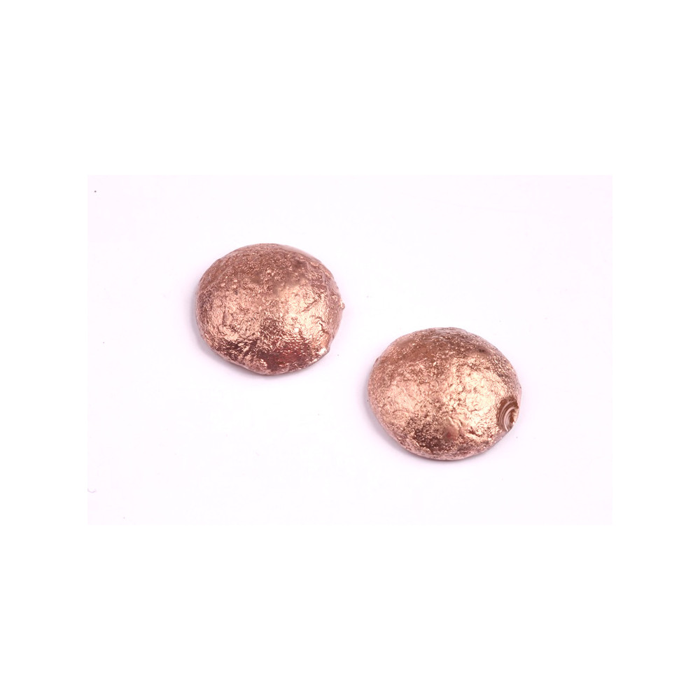 Rose gold odstín s unikátním matným povrchem definuje tyto skleněné kabošony o průměru 18 mm. Každý kus reprezentuje precizní tradiční české sklářství z rodinné dílny Rutkovský, kde ruční výroba vdechuje komponentům neopakovatelný charakter. Kabošony jsou stvořeny pro techniku bead embroidery neboli korálkovou výšivku, ale skvěle poslouží i k vlepování do kovových lůžek při tvorbě minimalistických náušnic či prstenů.