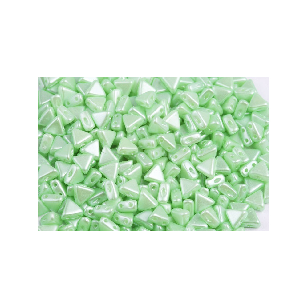 Khéops® par Puca® v jemném odstínu pastelově zelené s kódem barvy 02010/25023 představují precizně vybroušené trojúhelníkové korálky o velikosti 6 x 6 mm. Tento specifický dvoudírkový prvek je vyroben z prvotřídního českého skla, které zaručuje barevnou stálost a přesnost rozměrů. Díky dvěma průtahům o velikosti 0,8 mm umožňují tyto korálky vytvářet stabilní a prostorově zajímavé vzory, které by s klasickým rokajlem nebyly proveditelné.