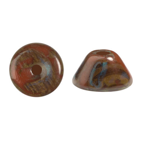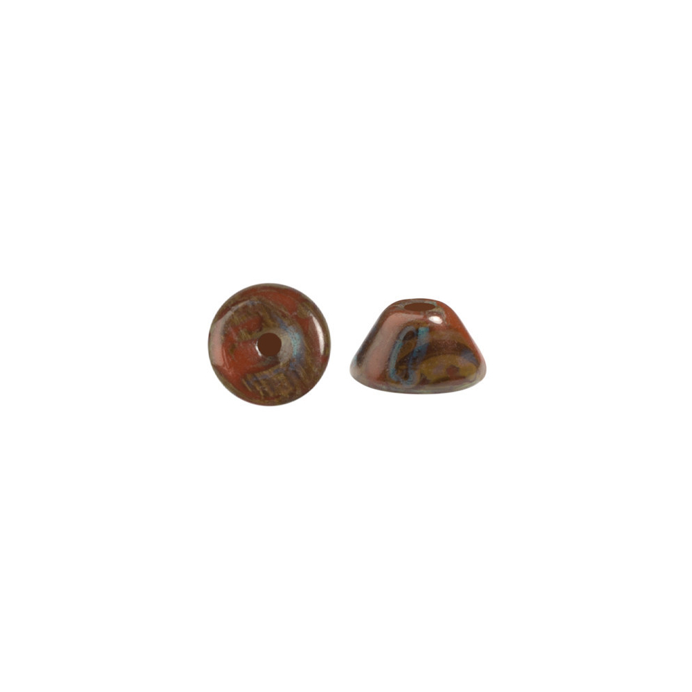 Konos® par Puca® v odstínu Frost Caramel Travertin (kód barvy 19460-86800) představují precizní komponent o rozměrech 2 x 4 mm s vnitřním průtahem 0,8 mm. Tyto kónické korálky z českého mačkaného skla se vyznačují geometrickou přesností, která je nezbytná pro náročné symetrické vzory a prostorové šití šperků. Specifický tvar umožňuje korálkům těsně přiléhat k dalším prvkům v designu, čímž zajišťují strukturální integritu celého díla.
