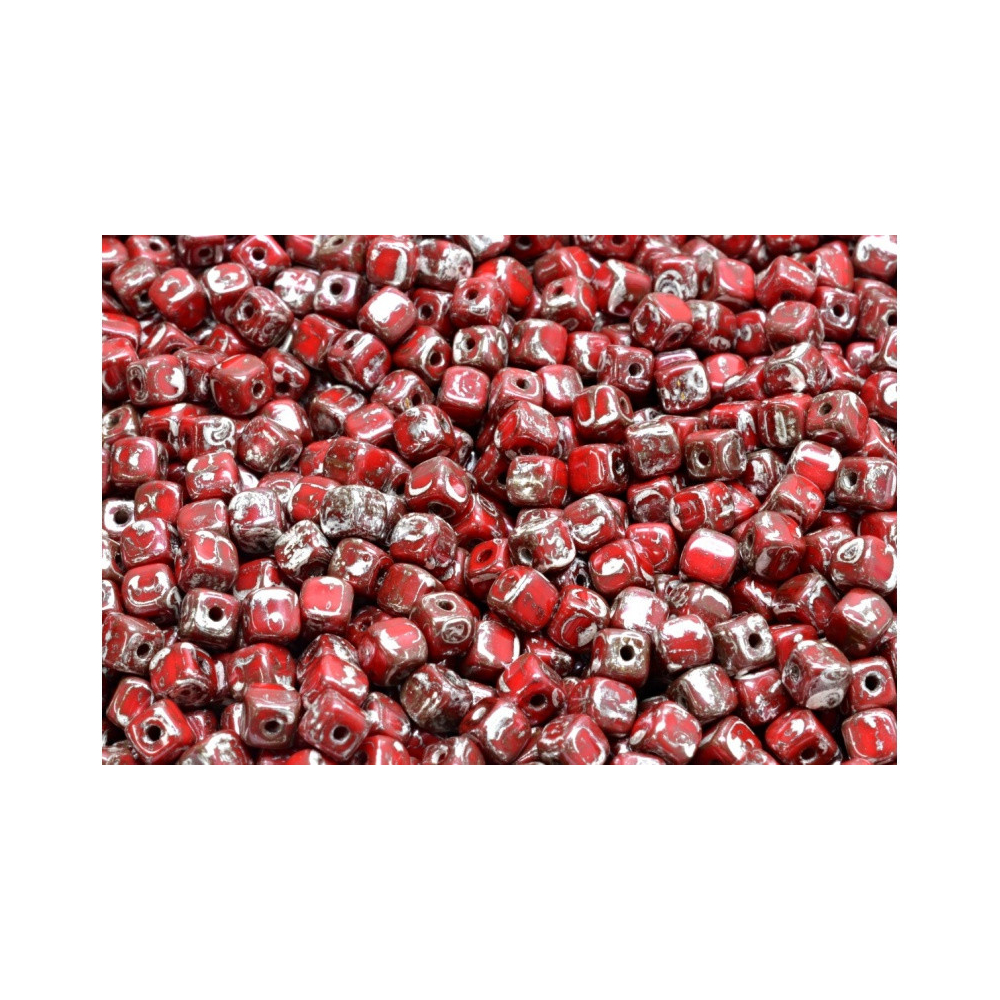 Sytá červená barva v kombinaci s unikátním mramorováním definuje tyto skleněné korálky, které vznikají pod rukama mistrů v rodinné firmě Rutkovský, Česká republika. Každý kus nese stopu tradičního řemesla z Jizerských hor, kde se ruční výroba korálků dědí z generace na generaci. Povrchová úprava Picasso dodává každé kostičce nezaměnitelný rustikální vzhled, který vynikne v moderních i vintage designech.