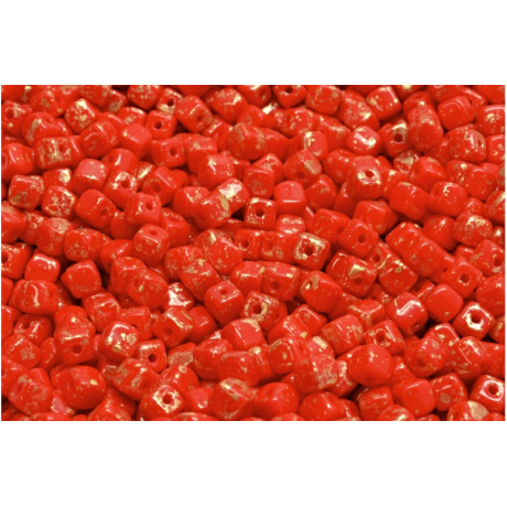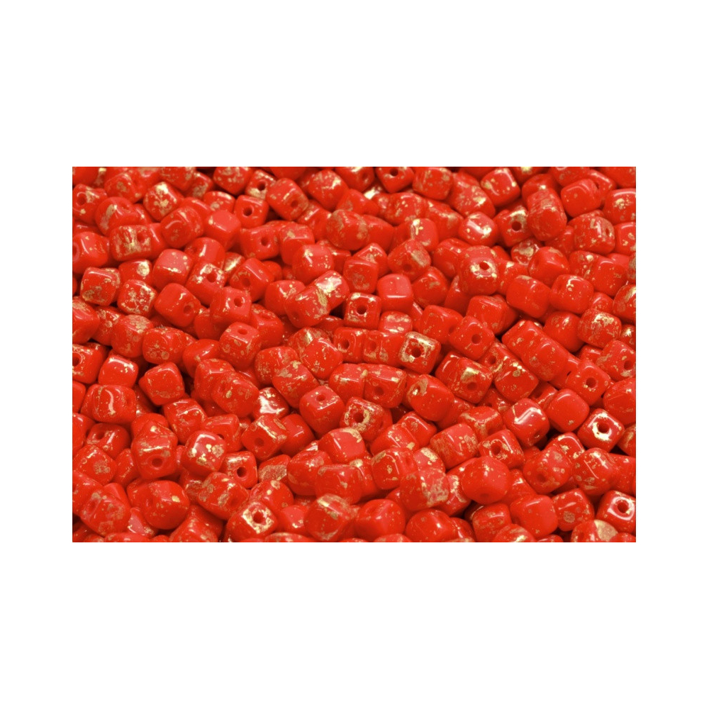 Korálově červený odstín s dekorativním zlatým postřikem definuje tyto skleněné korálky Cube Beads 4 x 4 mm z dílny rodinného výrobce Rutkovský. Tradiční české sklářství se zde snoubí s precizním ručním lisováním, které zaručuje tvarovou stálost každé kostičky o rozměru 4 x 4 mm. Díky přesnému průtahu 0,8 mm jsou tyto české korálky ideální pro navlékání na standardní materiály, přičemž jejich neprůhledný (opaque) základ poskytuje sytý a hluboký barevný kontrast pro jakýkoliv šperkařský projekt.