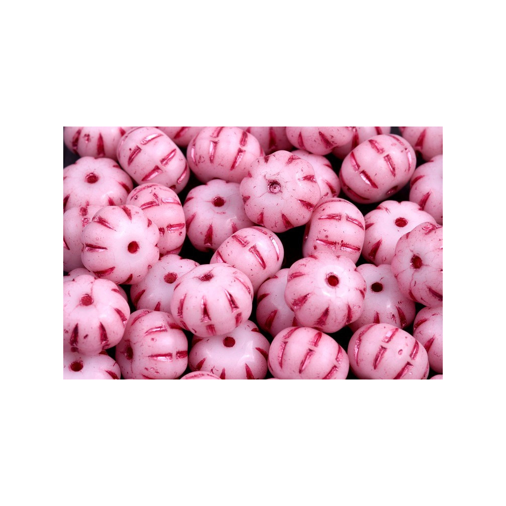 Jemně růžový odstín alabastrového skla s výrazným sytým dekorem v rýhách definuje tyto unikátní Pumpkin Beads o rozměru 8 x 11 mm. Na rozdíl od běžných strojově vyráběných komponentů vynikají tyto ručně mačkané korálky od tradičního českého výrobce Rutkovský svou organickou texturou a hloubkou barevného provedení. Tato technika nanášení kontrastního dekoru do hlubokých prohlubní zajišťuje, že každý šperk získá autentický starožitný nádech, který u běžných celobarevných skleněných kuliček nenajdete.