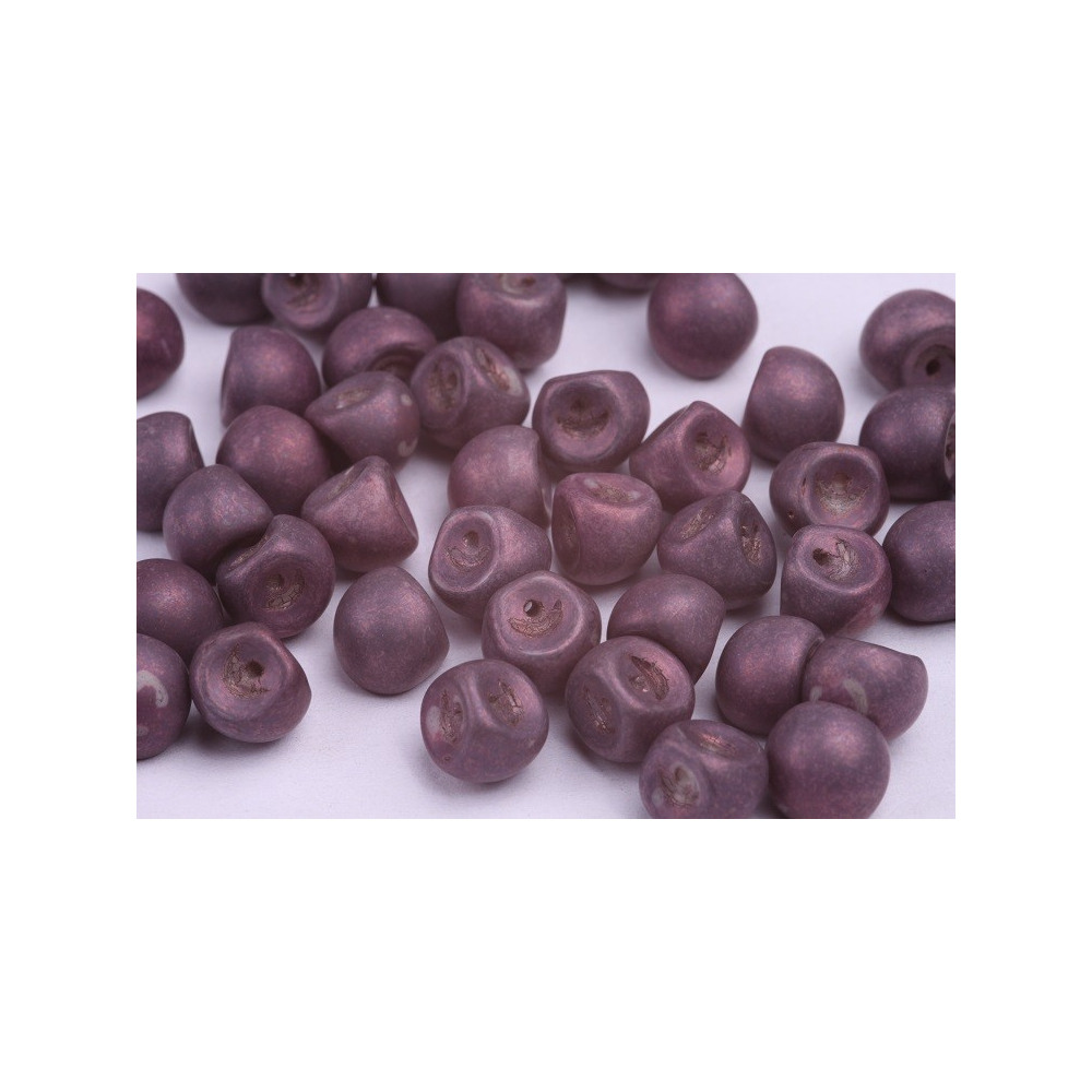 Fialová barva v kombinaci s matným iris povrchem dodává těmto skleněným korálkům typu Mushroom Button Beads hloubku, kterou u běžných průhledných korálků nenajdete. Na rozdíl od strojově broušených perel nabízí tyto ručně mačkané korálky od rodinné firmy Rutkovský organický vzhled, jenž je výsledkem tradičního českého sklářství. Unikátní tvar houbičky o rozměru 9 x 8 mm se v designu chová stabilněji než klasické kuličky, což oceníte zejména při tvorbě prostorových objektů.