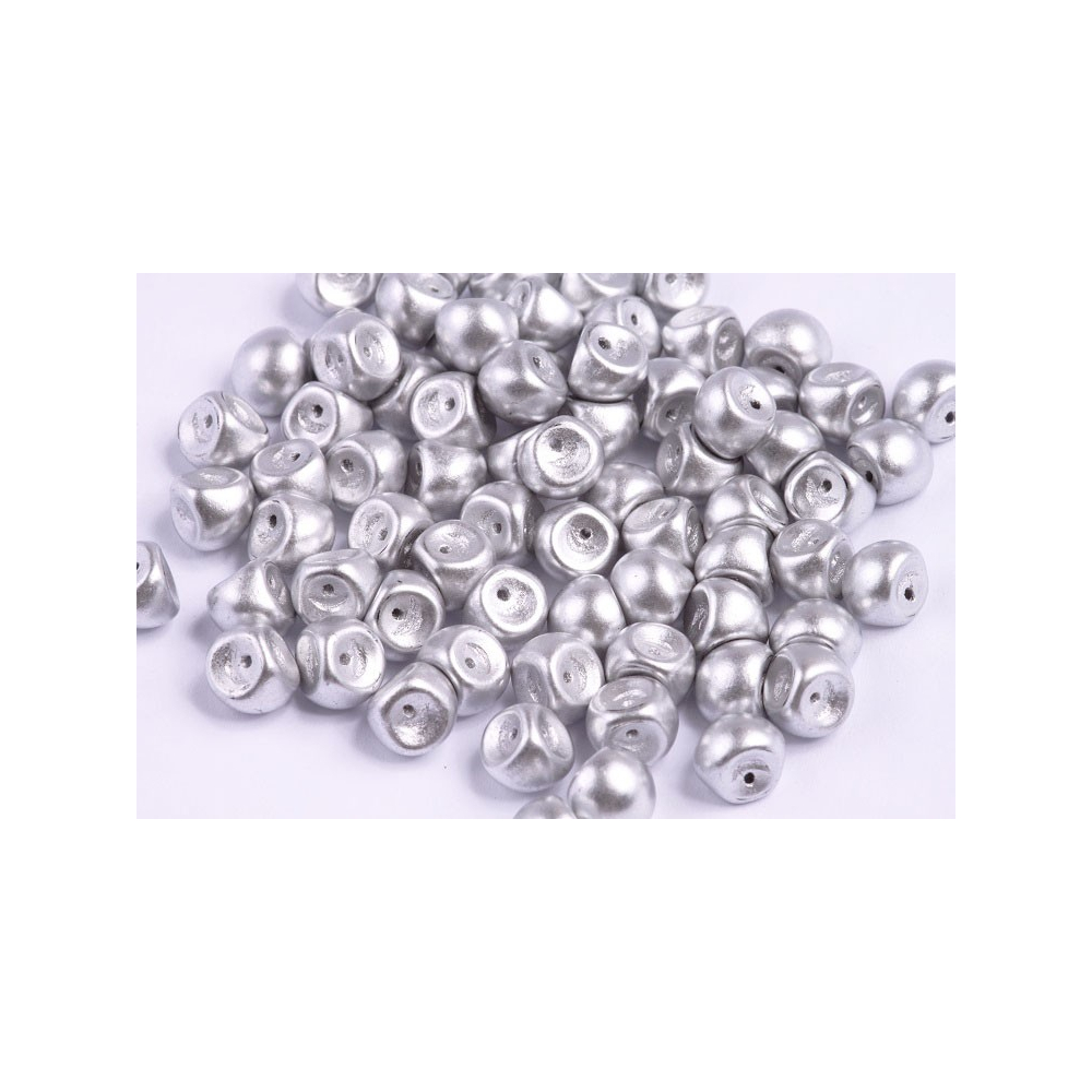 Skleněné Mushroom Button Beads o rozměru 9 x 8 mm představují precizní ukázku tradičního českého řemesla z dílny rodinné firmy Rutkovský. Ručně mačkané korálky se vyznačují specifickým asymetrickým tvarem připomínajícím klobouček houby, který do autorských šperků vnáší organický a hravý prvek. Stříbrný povrchová úprava s efektem hliníku dodává sklu moderní industriální nádech a jemný saténový lesk, který vynikne v každém světle.