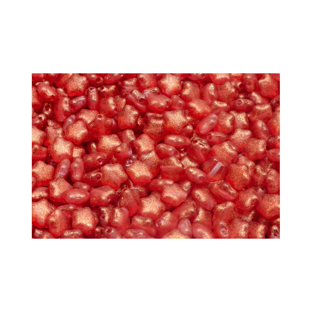 Materiál sklo a zářivý povrch s metalickými odlesky vyniknou zejména v kombinaci s drobným rokajlem Preciosa velikosti 10/0 nebo 11/0. Korálky hvězdičky 6 x 6 mm s průtahem 0,8 mm jsou perfektní pro vánoční dekorace, originální dárky i elegantní doplňky, které vyžadují červený tóny s nádechem luxusního zlata.