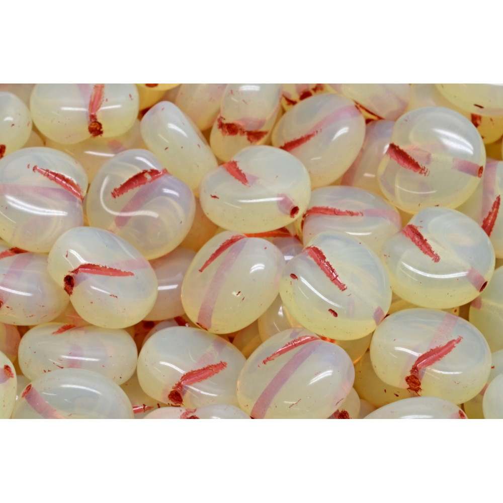 Jemně krémový odstín s nádechem opálu a kontrastní červenou linkou v rýze vytváří z těchto Apple Beads jedinečný prvek pro vaši tvorbu. Každý kus nese stopy precizní práce, kterou se vyznačují české skleněné korálky od rodinné firmy Rutkovský. Vizuální hloubka materiálu připomíná přírodní polodrahokamy a dodává hotovým šperkům luxusní nádech a vizuální dynamiku.