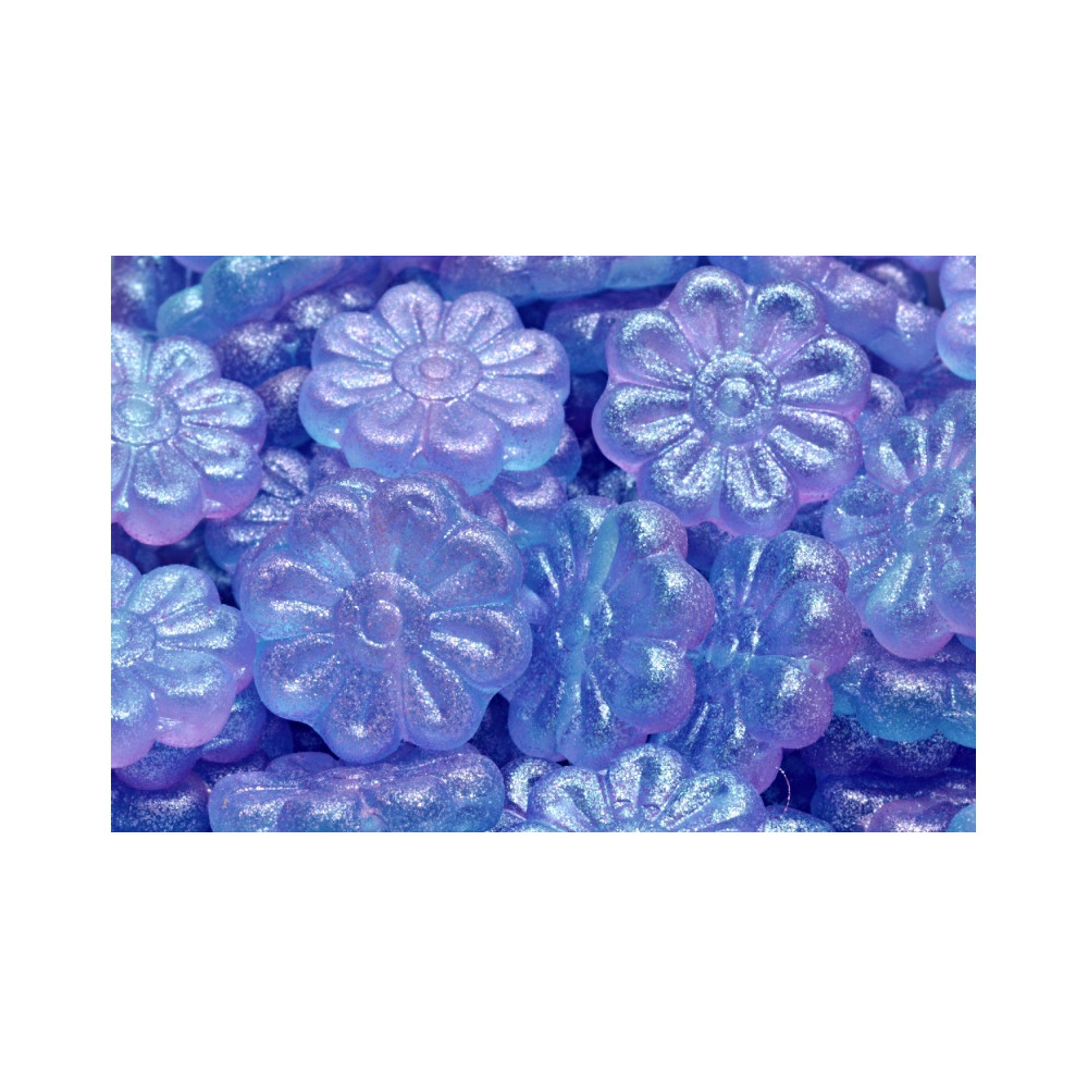 Jemná světle modrá barva s hlubokými lila odlesky a magický třpytivý povrch dělají z těchto mačkaných skleněných korálků ve tvaru květu kopretiny naprosto unikátní prvek pro kreativní tvorbu. Jejich vizuální stránka kombinuje něhu přírodního motivu s moderním efektem, který připomíná hvězdný prach uvízlý v mrazivém skle.