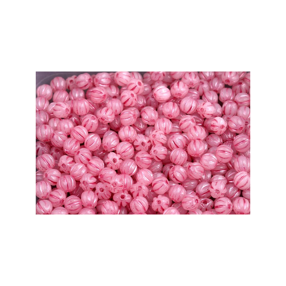 Melon Beads 4 x 4 - skleněné mačkané korálky ve tvaru melounů Alabaster Opal Pink Painted