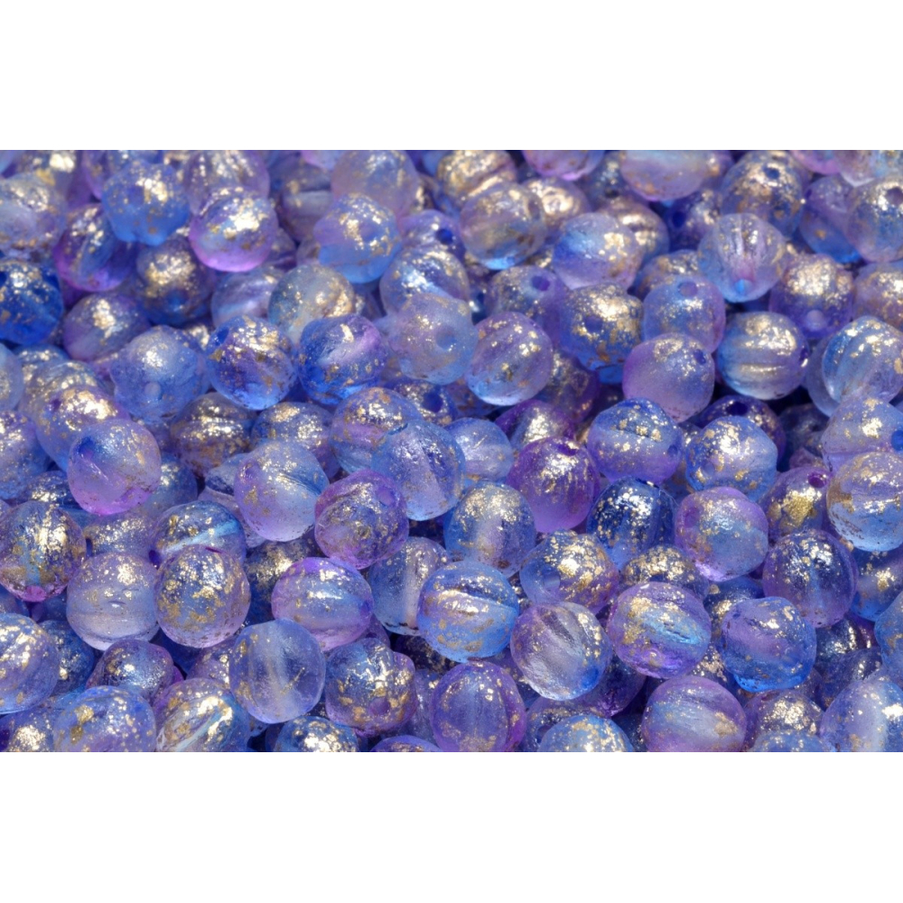 Jemné náušnice s nádechem historie vzniknou spojením těchto originálních skleněných prvků a drobných kovových komponentů v barvě bronzu. Melon Beads 6 x 6 mm v podmanivé kombinaci modré a lila barvy se zlatým dekorem představují ideální volbu pro šperkařky, které hledají rovnováhu mezi vintage stylem a moderní elegancí. Ručně mačkané skleněné korálky od rodinné firmy Rutkovský nesou pečeť poctivého řemesla a tradice, která sahá hluboko do historie severních Čech.