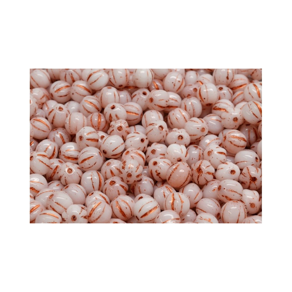 Bílá barva v kombinaci s jemným měděným dekorem v rýhách dává těmto skleněným korálkům nezaměnitelný charakter, který vynikne v každém autorském šperku. Tyto ručně mačkané korálky typu Melon Beads 6 x 6 mm pocházejí z dílny rodinné firmy Rutkovský, Česká republika, kde se dodnes s láskou udržuje tradiční české sklářství a jedinečné formy. Díky preciznímu zpracování a unikátnímu tvaru připomínajícímu kuličku s drážkami jsou tyto korálky Meloun ideální pro tvorbu elegantních náramků i náhrdelníků s nádechem historie.