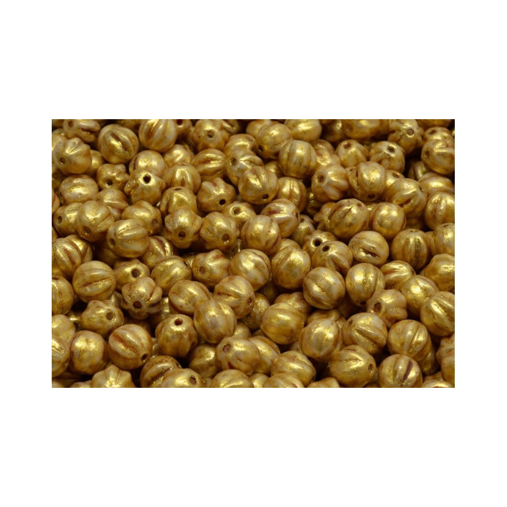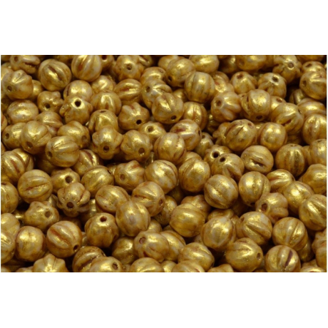 Pískově béžový základ s výrazným zlatým efektem definuje tyto unikátní Melon Beads 6 x 6 mm. Tyto české skleněné korálky pocházejí z rodinné dílny Rutkovský, kde se stále udržuje tradice pro ručně mačkané sklo. Výrazné rýhování připomínající meloun dodává každému kusu zajímavou texturu a hloubku, která oživí každý váš autorský šperk.