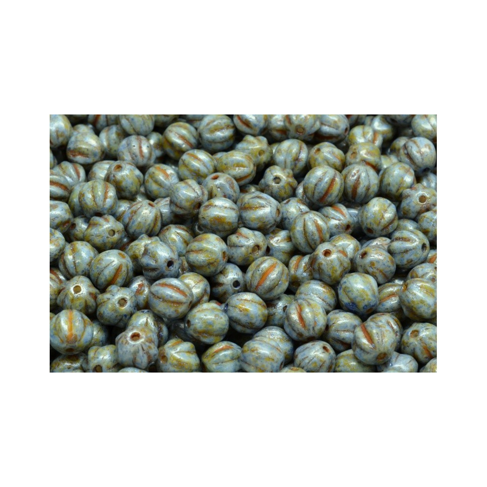 Světle modrá barva s jemným žíháním dodává těmto korálkům nezaměnitelný rustikální vzhled, který vynikne v každém autorském šperku. Tyto Melon Beads 6 x 6 mm se vyznačují hlubokým rýhováním, které věrně připomíná tvar drobného melounu, a jejich neprůhledný povrch s hnědou patinou skvěle doplňuje přírodní materiály i kovové komponenty v barvě staromědi.