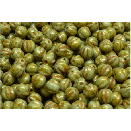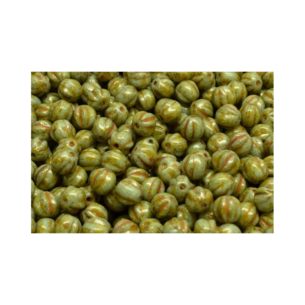 Zelená barva s jemným kropenatým efektem a tradiční rýhovaný tvar dělají z těchto korálků Melon Beads 6 x 6 mm nepostradatelný prvek pro každého designéra šperků. Tyto ručně mačkané skleněné korálky pocházejí z dílny rodinné firmy Rutkovský, Česká republika, kde se snoubí poctivé tradiční české sklářství s moderními trendy. Povrchová úprava s hnědými tóny v drážkách připomíná přírodní kameny a skvěle zapadá do aktuálního trendu organického designu a vintage stylu.
