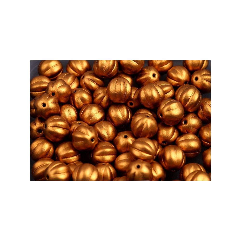 Bronzový odstín s nádechem zlata dodává těmto ručně mačkaným skleněným prvkům nádech starobylého luxusu. Korálky Meloun 8 x 8 mm vynikají precizním drážkováním, které věrně připomíná plody melounu a vytváří na povrchu zajímavou hru světla a stínu. Tento tvar je v mezinárodní terminologii známý jako Melon Beads a patří k pilířům tradičního českého sortimentu.