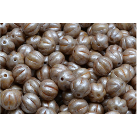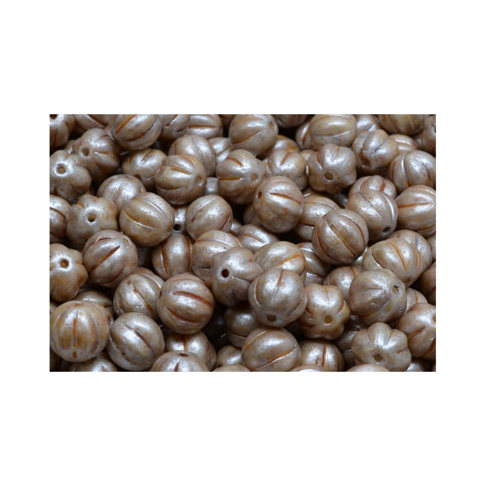 Melon Beads 4 x 4 - skleněné mačkané korálky ve tvaru melounů WHITE ALABASTER GOLD LUSTER...