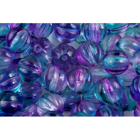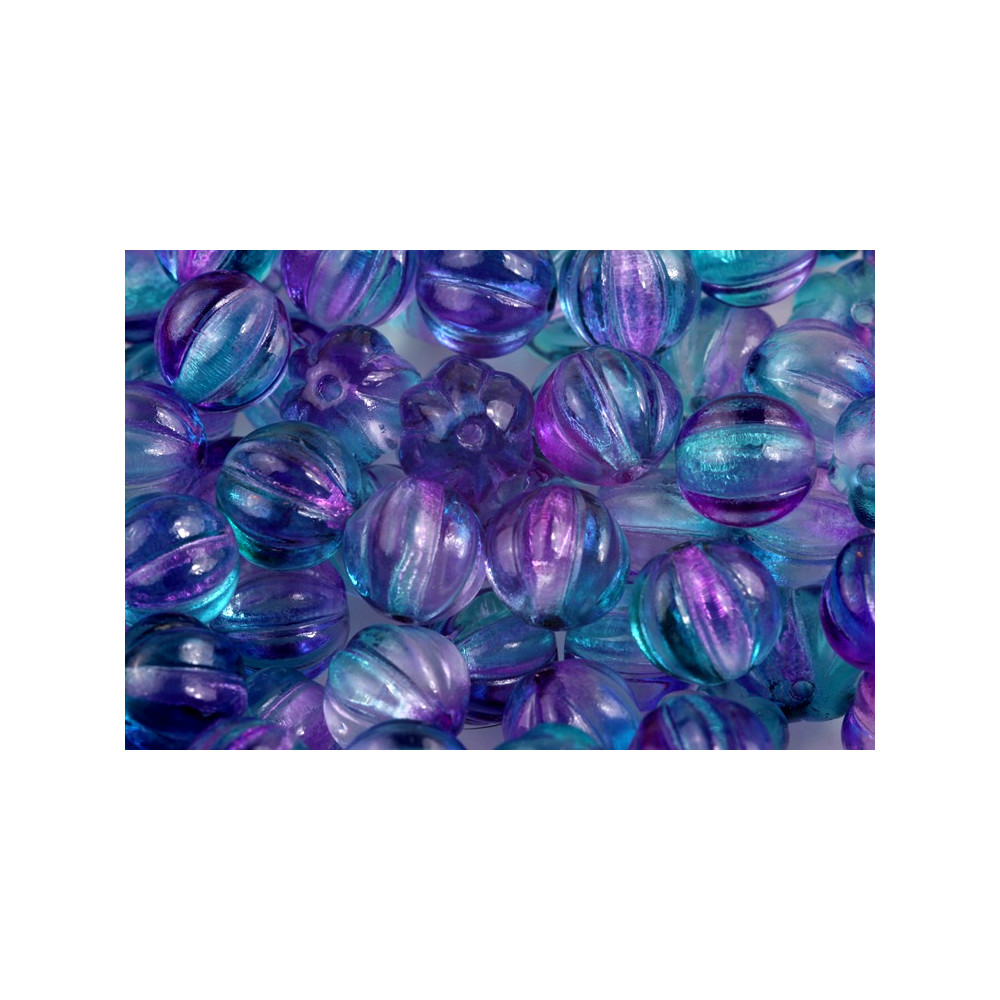 Fialové a tyrkysový odstíny se plynule prolínají v každém detailu těchto ručně mačkaných skleněných prvků, které svým tvarem připomínají drobný plod. Melon Beads 8 x 8 mm představují dokonalou symbiózu tradičního řemesla a moderního designu, přičemž jejich matný povrch s jemným leskem dodává hotovým šperkům hloubku a sofistikovanost. Každý kus je výsledkem precizní práce v Jizerských horách, kde se sklářské umění předává z generace na generaci a kde vznikají ty nejkrásnější skleněné korálky.