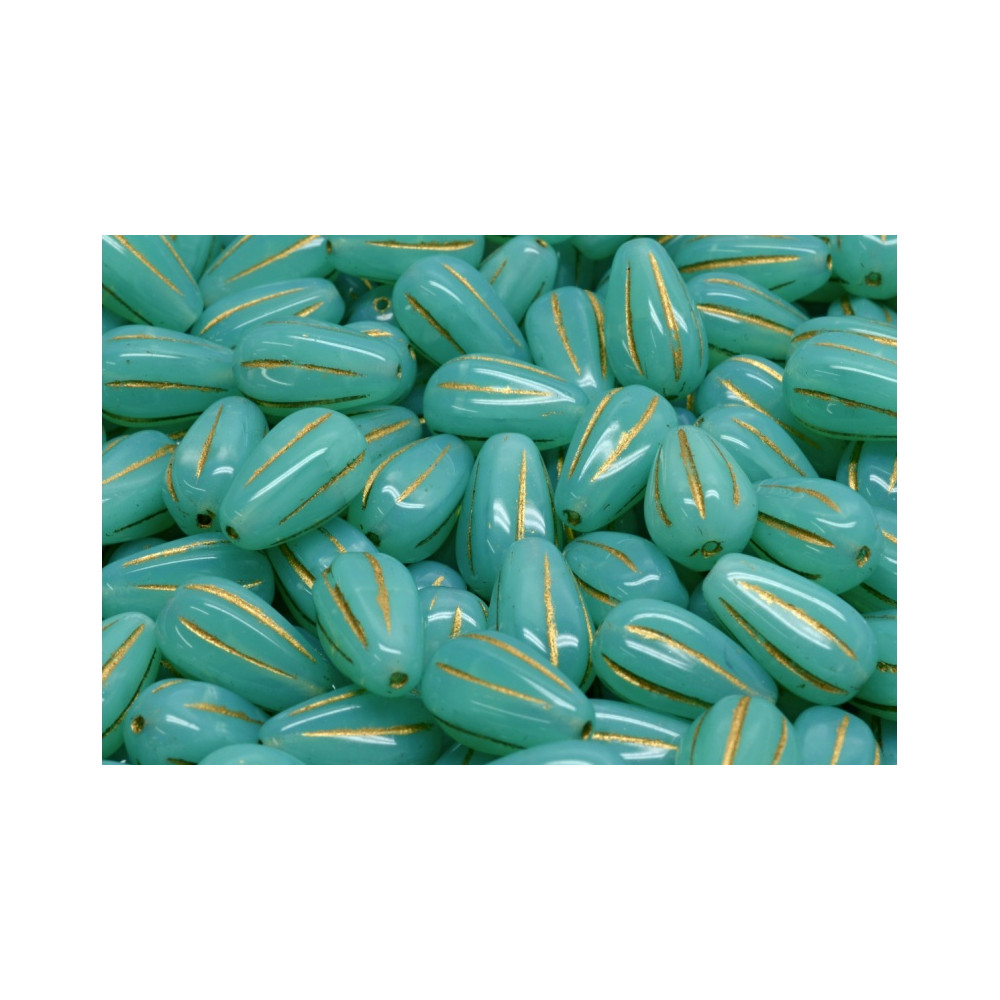 Tyrkysový odstín v kombinaci se zlatým dekorem přináší do tvorby šperků prvek luxusu a tradice, kterou ztělesňují tyto české skleněné korálky. Ručně mačkané Drop Melon Beads o rozměru 13 x 8 mm jsou výsledkem precizní práce rodinné firmy Rutkovský, Česká republika, která se věnuje sklářskému řemeslu po generace. Specifické drážkování připomínající povrch melounu dodává každému kusu jedinečnou texturu a hloubku, což z nich činí ideální komponent pro originální autorské projekty.