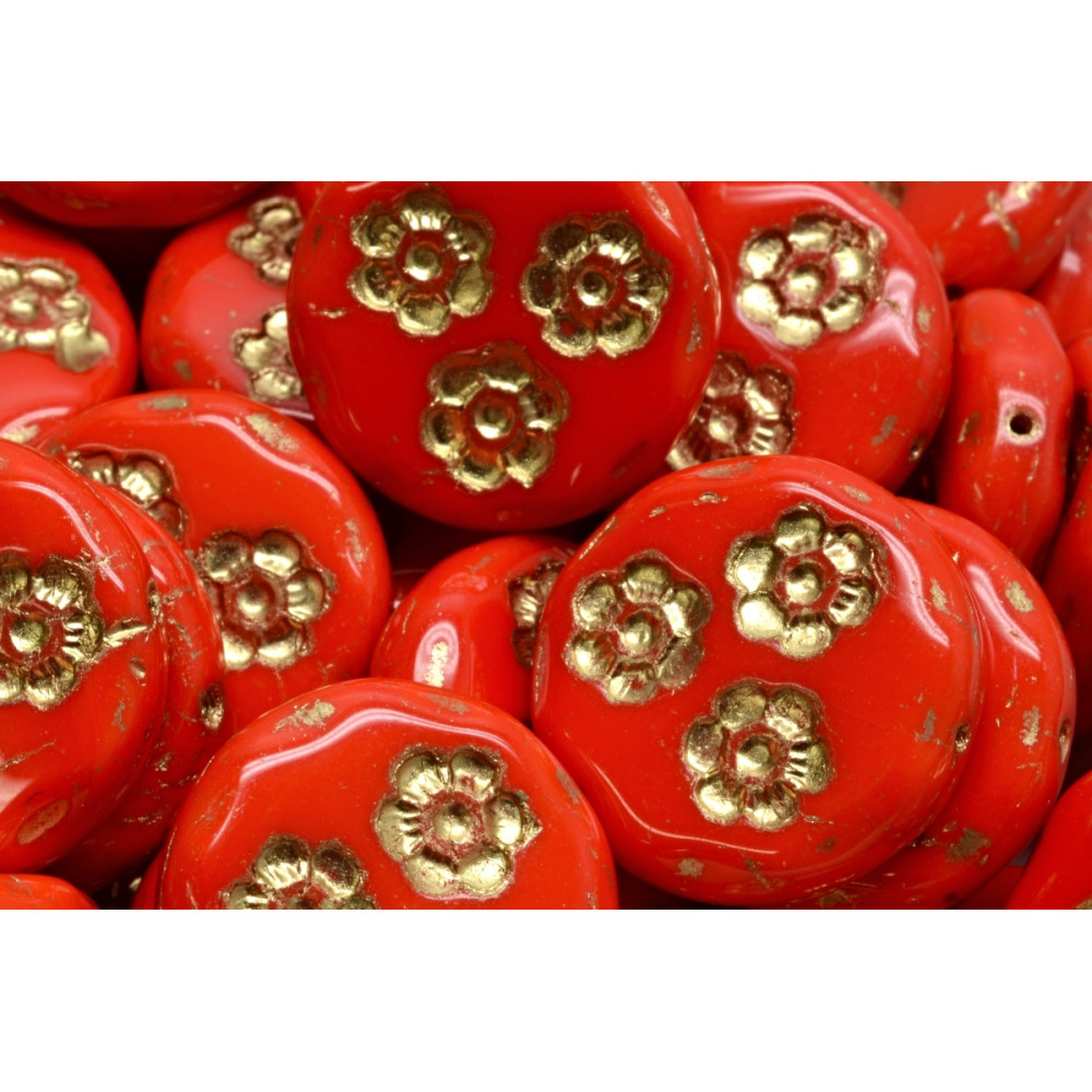Tento jedinečný sortiment skleněných plochých korálků "Flower Trio Coin Bead 21mm" od firmy Rutkovský představuje vrchol řemeslné zručnosti a originality.
