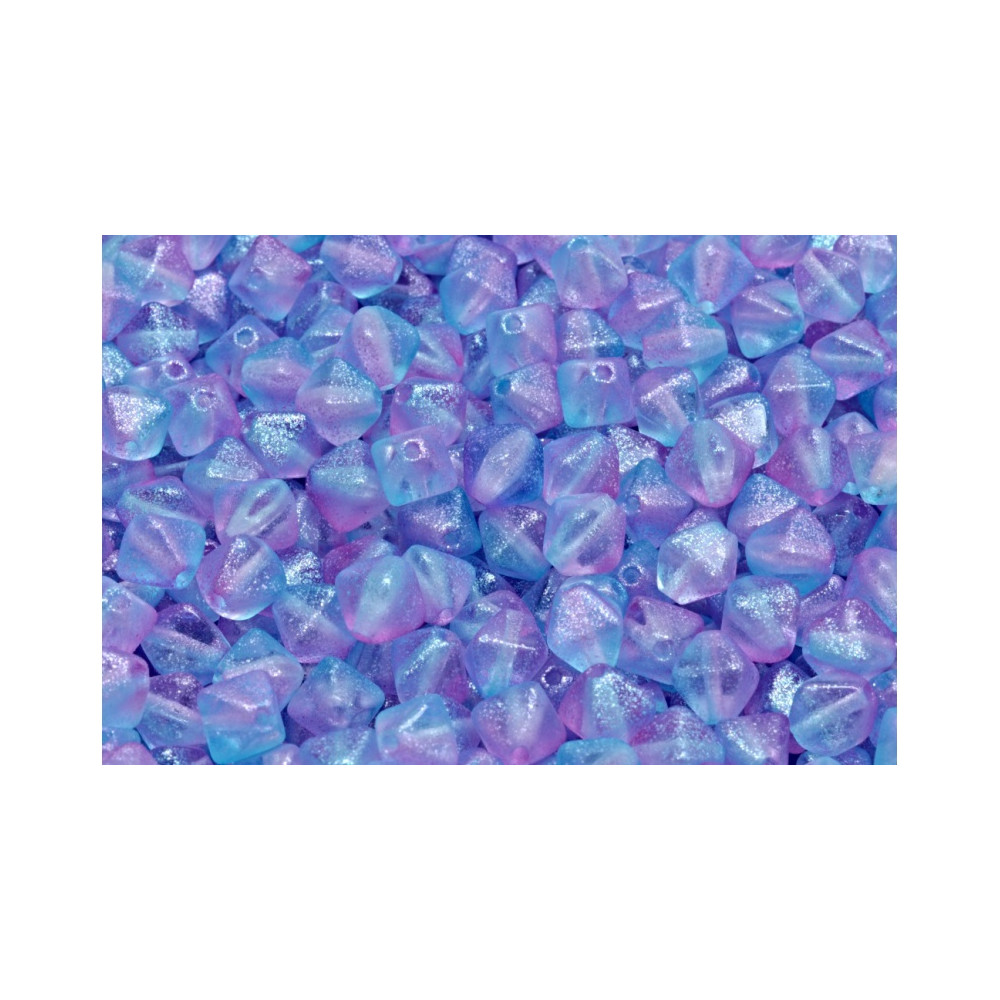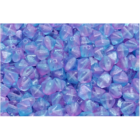 Světle modrá v harmonické kombinaci s lila odstíny vytváří na povrchu těchto korálků snový efekt, který okamžitě upoutá pozornost v každém šperku. Mačkané skleněné korálky typu Lucerny, Spinner (mezinárodně známé jako Lantern & Spinner Beads) představují unikátní alternativu ke klasickým broušeným biconům, neboť nabízejí měkčí linie a specifický lom světla díky své poloprůsvitné struktuře.