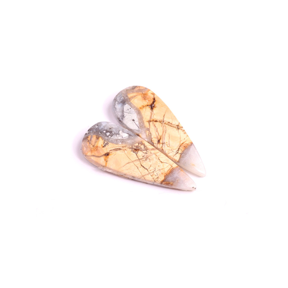 Tyto párové kabošony byly vyrobeny z jednoho kusu kamene a pečlivě opracovány tak, aby jejich kresba ladila a tvořila harmonický pár. Jsou ideální volbou pro výrobu náušnic nebo symetrických šperků, kde je jejich přírodní krása vynikne naplno.