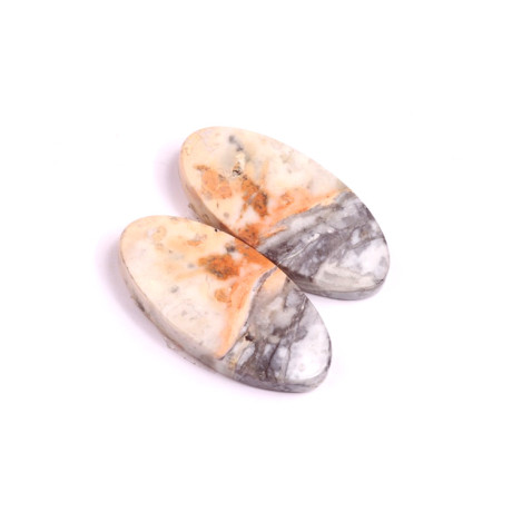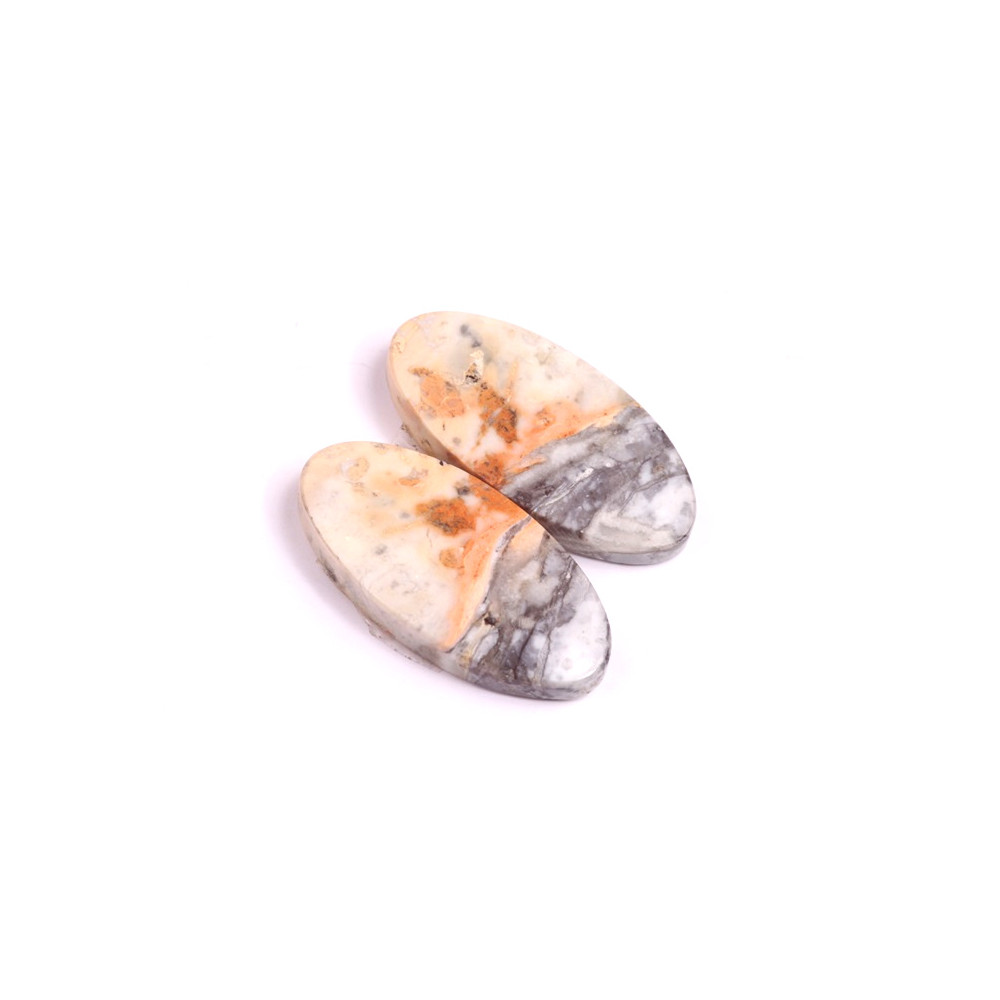 Tyto párové kabošony byly vyrobeny z jednoho kusu kamene a pečlivě opracovány tak, aby jejich kresba ladila a tvořila harmonický pár. Jsou ideální volbou pro výrobu náušnic nebo symetrických šperků, kde je jejich přírodní krása vynikne naplno.