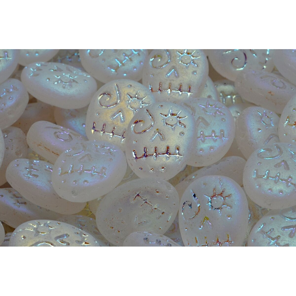 Bílá barva s jemnými duhovými odlesky tvoří dokonalý základ pro nápaditý náramek s etnickým nádechem, který upoutá pozornost na první pohled. Tyto skleněné korálky s motivem obličeje, známé pod mezinárodním názvem Mask Beads, vnášejí do bižuterní tvorby prvek tajemna i hravosti. Skvěle se vyjímají jako centrální prvek v náušnicích nebo jako originální přívěsek na klíče, kde vynikne jejich detailní reliéf a opalizující povrchová úprava.