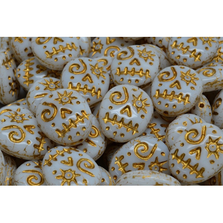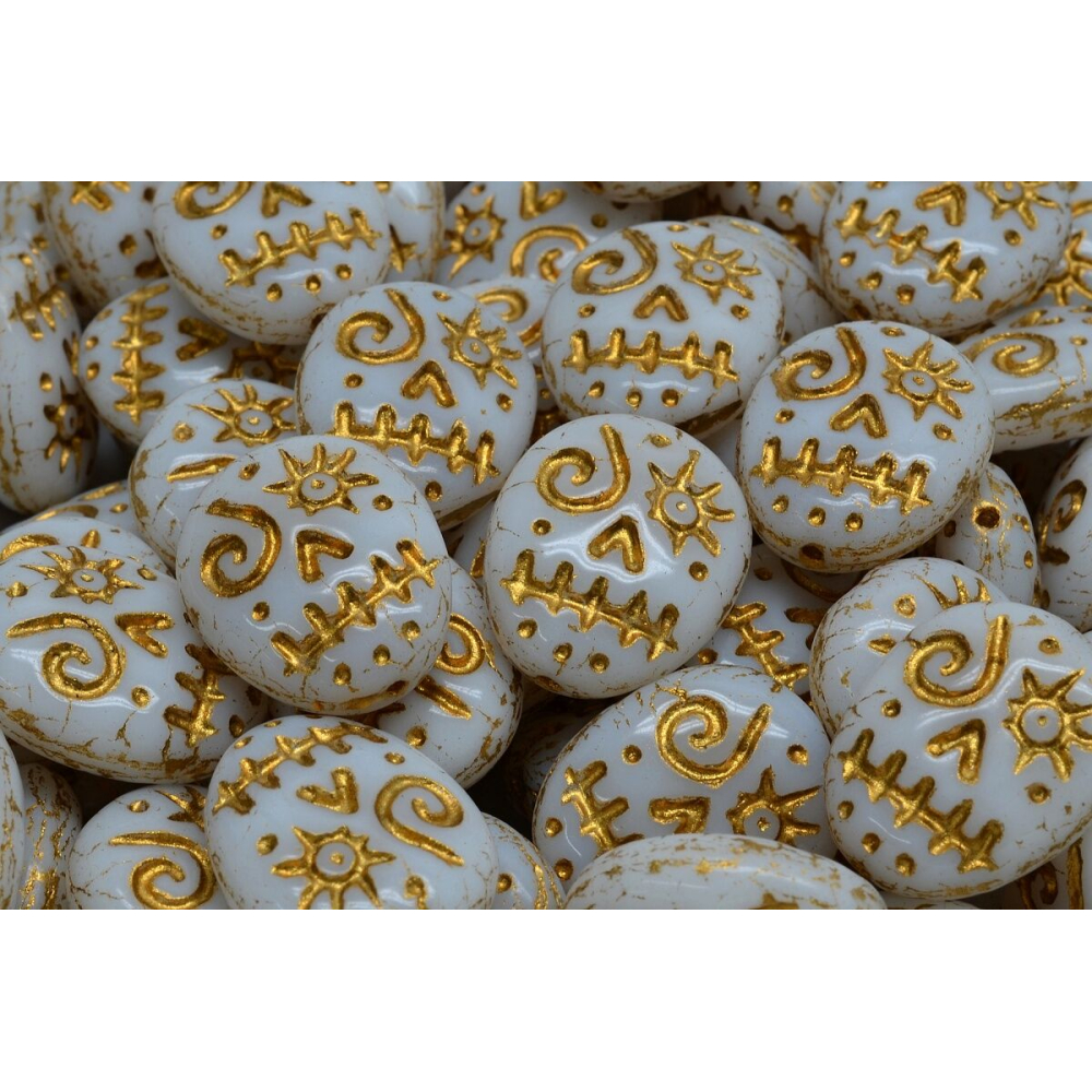 Bílá barva v kombinaci s výraznou zlatou patinou dává těmto skleněným korálkům typu Mask Beads nezaměnitelný charakter. Co mě na nich osobně fascinuje, je precizní detail vylisovaného obličeje, který v každém šperku vytvoří silný ústřední prvek s nádechem mystiky a exotiky. Tato Maska o rozměru 16 x 13 mm vynikne nejlépe v jednoduchých návlecích i složitějších kompozicích, kde hraje prim ruční výroba a originální design.