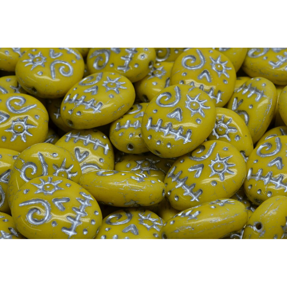 Mask Beads (česky Maska) s charakteristickým voodoo motivem a kontrastní stříbrnou povrchovou úpravou v prohlubních nabízejí designérům prostor pro tvorbu výrazných náhrdelníků a originálních náušnic s nádechem mystiky. Opaque žlutý základ v kombinaci s metalickým efektem vytváří vizuálně silný prvek vhodný pro moderní bižuterii.