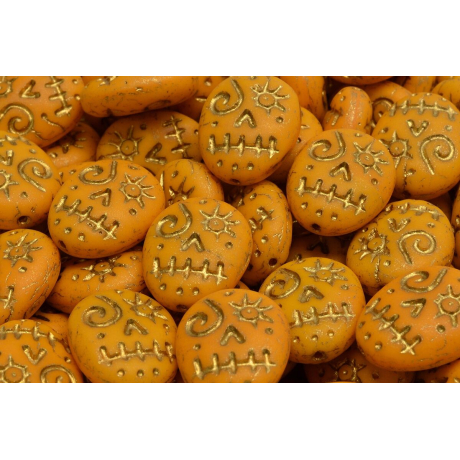 Voodoo motivy a etnické prvky jsou vynikající pro tvorbu originálních náramků či náhrdelníků, které vyžadují výrazný ústřední prvek. Tyto oranžové korálky s matným povrchem a zlatou patinou skvěle doplňují techniky jako navlékání nebo ketlování. Díky preciznímu průtahu o velikosti 0,8 mm je snadno zkombinujete s rokajlem Preciosa velikosti 8/0 nebo 10/0 v kovových odstínech pro dosažení harmonického vzhledu.