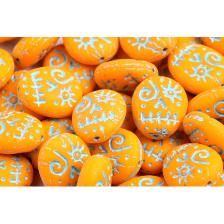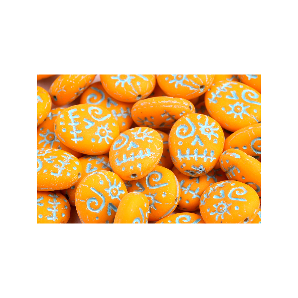 Sytě oranžová barva s modrou patinou definuje tyto originální Mask Beads od rodinné firmy Rutkovský. Ručně mačkané skleněné korálky vnášejí do autorské tvorby hravost i nádech exotické mystiky. Každý kus nese stopy precizní práce a tradičního českého sklářství, které se odráží v unikátním detailu tváře.