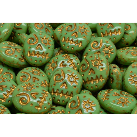 Svěží zelená barva v kombinaci s precizním zlatým dekorem vdechuje těmto korálkům Mask Beads nezaměnitelný charakter, který okamžitě upoutá pozornost v každém autorském šperku. Tento unikátní tvar, připomínající rituální masky nebo hravé obličeje, otevírá dveře k nekonečné fantazii při tvorbě tematických náhrdelníků i náramků s nádechem exotiky či boho stylu.