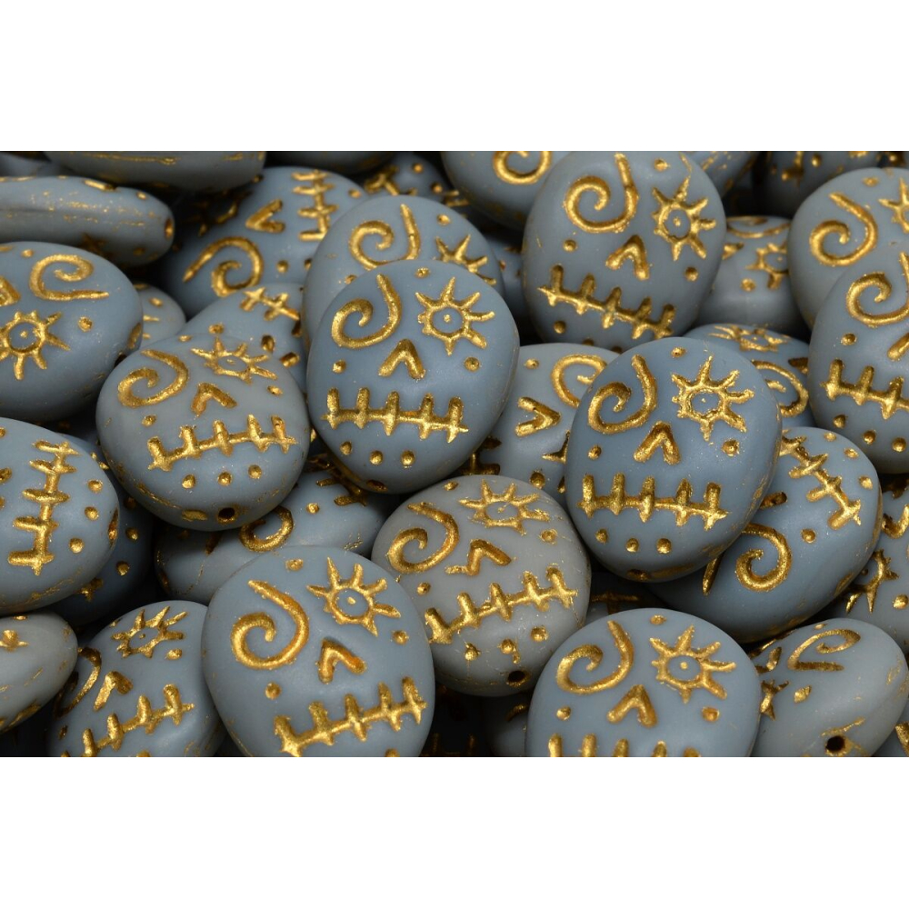Matná textura základního skla v odstínu holubí šedi vytváří dokonalý kontrast k lesklým zlatým linkám, které vykreslují stylizovaný obličej. Tyto české korálky o rozměru 16 x 13 mm jsou vyhledávaným prvkem pro tvůrce, kteří hledají neotřelé tvary a etno nádech pro své autorské projekty.