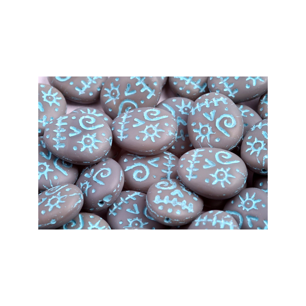 Šedá barva v kombinaci s tyrkysovou patinou vytváří z těchto skleněných korálků typu Mask Beads naprosto unikátní designový prvek. Každý kus nese stopy precizní práce, kdy je do hloubky reliéfu masky vpravena kontrastní barva, která dává vyniknout detailním rysům obličeje a mystickým symbolům.
