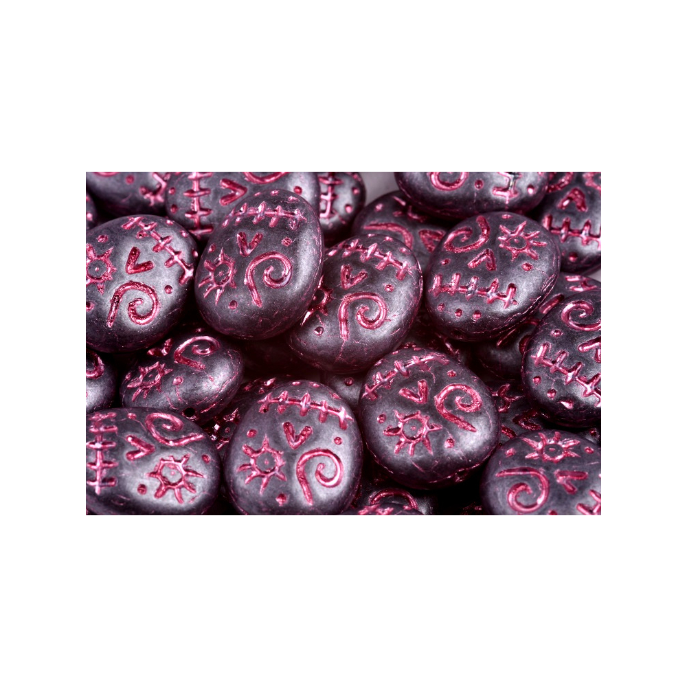 Antracitový základ s metalickými fuchsiovými detaily definuje tyto unikátní skleněné korálky ve tvaru Mask Beads. Tento výrazný design od výrobce Rutkovský přináší do vaší tvorby mysteriózní prvek inspirovaný lidovým uměním a etno stylem. Každý korálek nese detailní reliéf obličeje, který vyniká díky kontrastní povrchové úpravě a hloubce lisu.