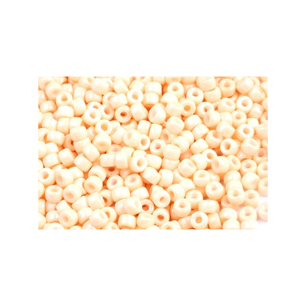 Jemná broskvová barva na neprůhledném základu dodává šperkům hřejivý a luxusní nádech, který přetrvá roky. Krásně ladí se zlatými tóny, nebo ji pro výrazný kontrast zkombinujte se safírově modrou či černým jetem. Pokud hledáte dynamické prvky pro olemování nebo tvorbu třásní, skvěle se k nim hodí skleněné čípky, které s tímto typem rokajlu vytvoří harmonický celek.