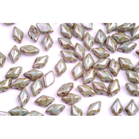 Světle modré tóny s jemným bronzovým nádechem připomínají hladinu jezera za svítání, na které se odrážejí první paprsky slunce. Tyto korálky Matubo ve tvaru kosočtverce o rozměru 8x5 mm přinášejí do vaší tvorby eleganci a preciznost, kterou oceníte při šití složitých vzorů i jednoduchých doplňků. Modrozelená barva s úpravou Chalk Blue Glaze působí velmi organicky a dodává hotovým šperkům starobylý, až rustikální charakter.