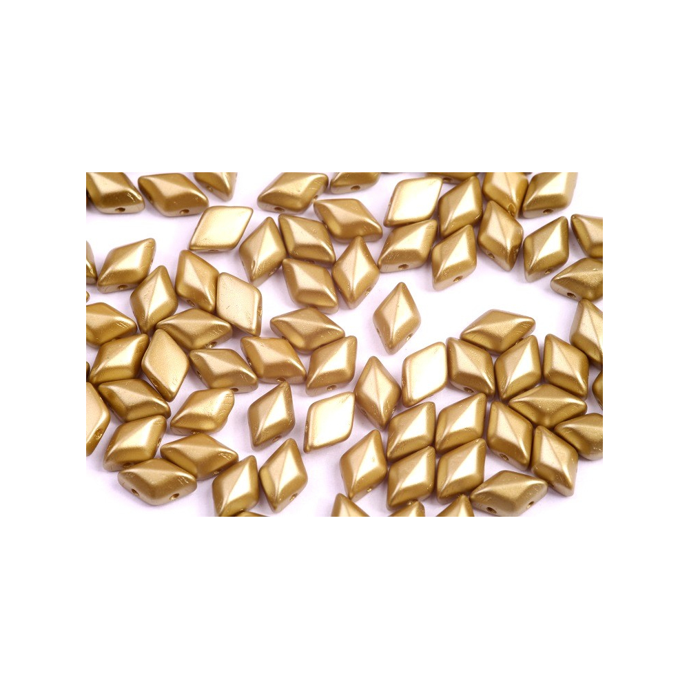 Geometrické vzory tvořené technikou bead weaving získávají s tímto tvarem zcela nový rozměr, ať už tvoříte náušnice nebo náhrdelníky. Tato zlatá barva krásně ladí s krémovou či slonovinovou pro vytvoření luxusního antického vzhledu, ale vynikne i v kontrastu s černým jetem. Do mezer mezi jednotlivými dílky můžete také velmi přirozeně vkládat české broušené ohňovky, které v kompozici poslouží jako zářivé rohové akcenty a dodají celku dynamiku.