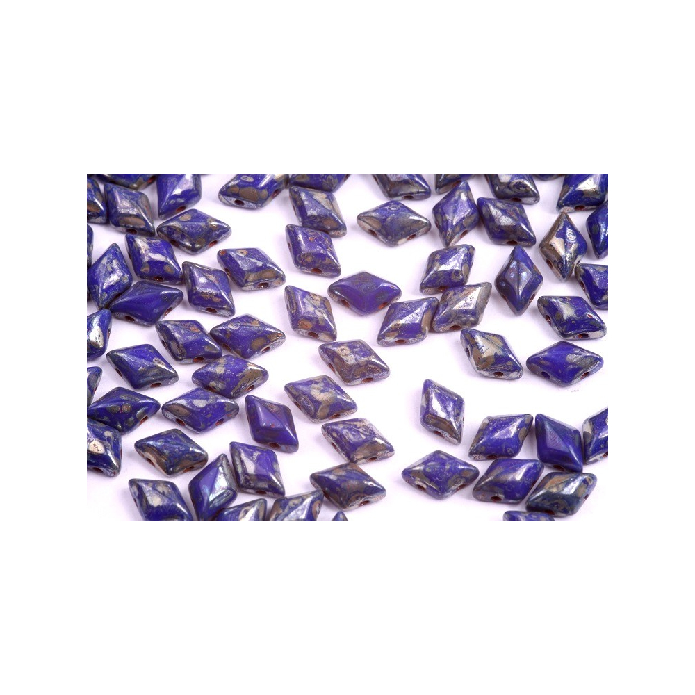 Opaque Blue Picasso povrchová úprava dodává těmto korálkům nezaměnitelný rustikální vzhled, který je v současném šperkařství nesmírně populární. Tento specifický finiš na sytě modrém podkladu vytváří organické mapy a textury, díky čemuž každý kus působí jako originál. Při navrhování se tyto dvoudírkové korálky skvěle doplňují s Matubo SuperDuo v hvězdicových a květinových vzorech, kde společně vytvářejí fascinující 3D efekty a bohaté geometrické struktury.